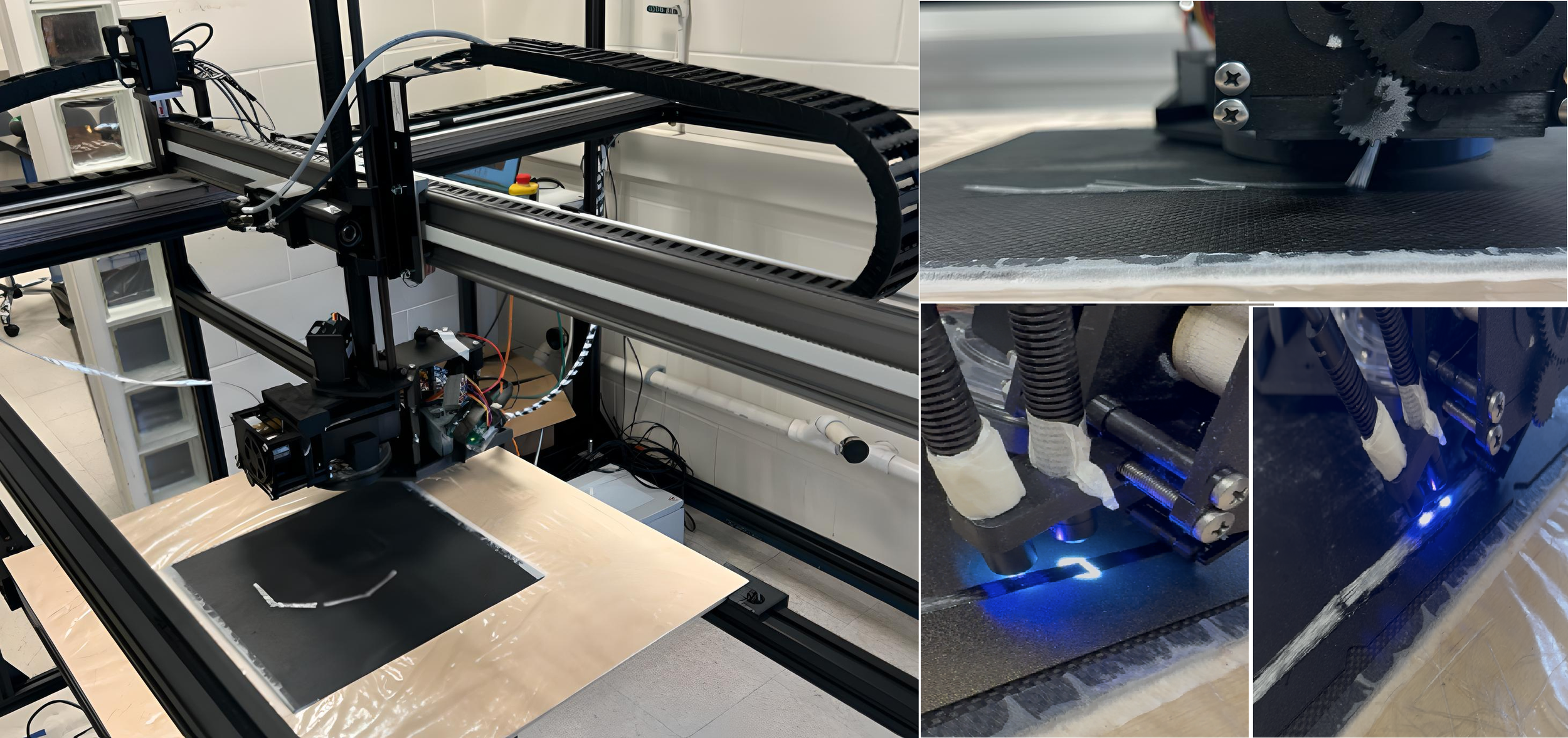 We are currently advancing an aligned long discontinuous composite additive manufacturing platform that enables thermoset 3D printing of large-scale parts up to 1.5 m × 1.5 m using a wide range of fiber types as raw feedstock. The objective is to optimize composite structures through programmable control of fiber alignment, fiber volume fraction, and fiber length, tailored to anticipated loading requirements and local performance demands. This approach supports the fabrication of lightweight thin-walled geometries as well as bulk plate architectures with spatially variable stiffness, allowing material to be placed and oriented only where it is structurally needed. The system is designed to deliver high-performance, scalable composite manufacturing with improved design freedom and production efficiency without sacrificing structural integrity.